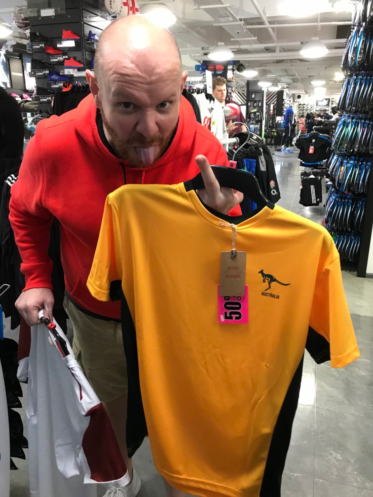 With an epic Ashes day looming, it was time to get our Aussie on. Of course I could have brought my Aussie bandana, Aussie flag or Aussie bikini from home but no, they are packed in a box somewhere! Between following the Geordie around while he searched for cricket outfit (?!?!?), I managed to find three cheap as chips Aussie rugdby tops, we can wear them to the cricket right? Same same??? The Geordie obvs loved the tops…