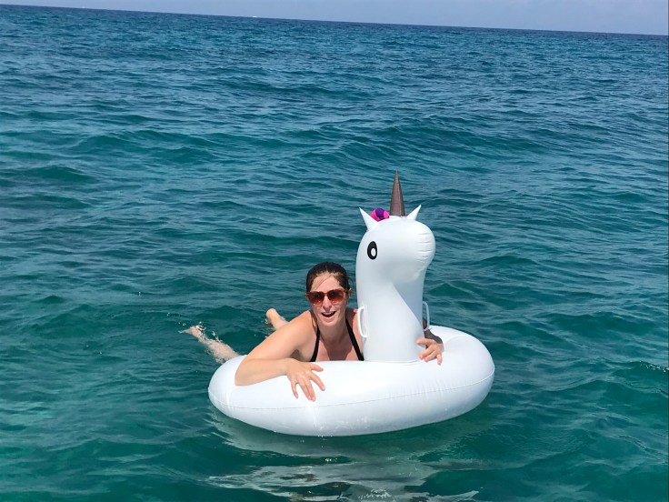Needless to say Kylie was bored after two minutes so went shopping and returned with a unicorn, flamingo and donut, of the floaty variety!!! Yeah, floating in the ocean on a donut with a cocktail, doesn’t get much more perfect. Kyles obvs has the unicorn and why the Geordie ended up with the flamingo made us question more than his aversion to heights. To his credit, or possibly his drunkedness, we managed to convince him to join us for more paddle slide action, this time with our unicorn, flamingo and donut in tow. Somehow I managed the luxury of dangling my feet in the water while the other two paddled their arses off to get us out to sea, and possibly halfway to Albania?!? More slippery dip action, Nora for some reason wouldn’t partake, no idea why. Geez that was fun, there really is nothing like swimming in the ocean. With a slippery dip. And a cocktail. And a donut. And music. And besties!!