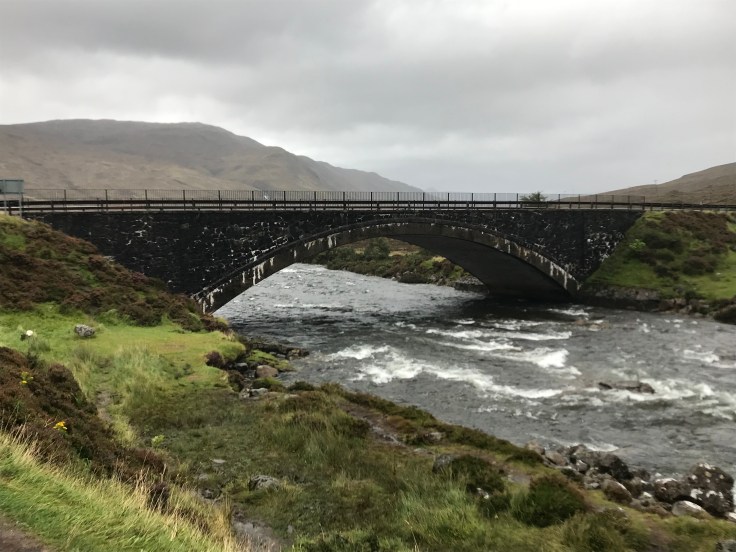 Once there was a clearing in the sideways rain, we were let off the bus for a pit stop at a place I can’t remember where there was a gorgeous stream and bridge with magnificent views over the Skye landscape. According to Dan, sick of saying the Man, if you stick your head in the stream, you can talk to the fairies!?! Of course everyone volunteered Dan the fairy Man to go first and to his credit, in his head went. Apparently the fairies told him he was bloody stupid and it was too cold to be sticking your head in streams… at least that’s what I translated from his Scottish…