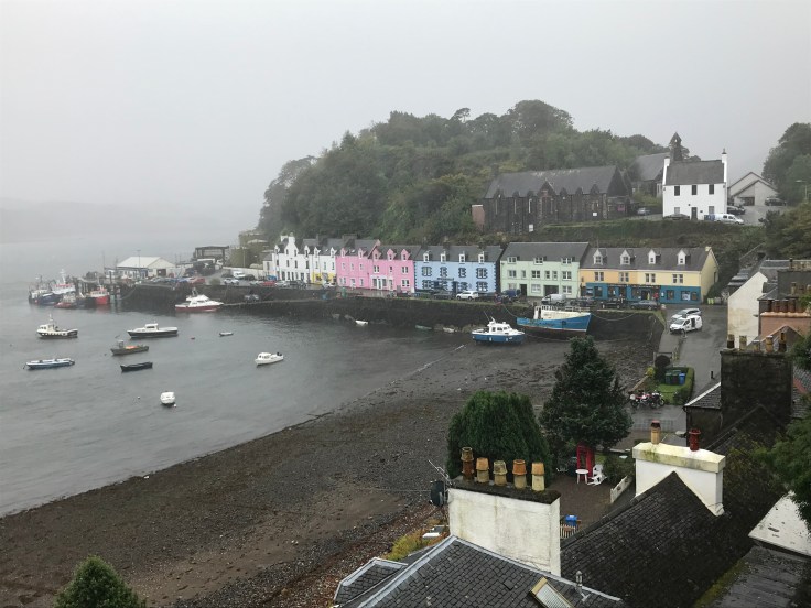 AOTB (work that one out!!) and we were headed for Portree, the main town in Skye. As per every town we stop in, Dan the tour guide Man points out all the good places to eat and the local attractions. Having been a shit tourist at the last stop, I decided I’d at least make an effort to walk up the hill to get a pic of the harbour and coloured houses. Thank the lord for Robert lending me his spare rain jacket cos this is what it looked like… you can’t see the rain but I think from the look on our faces you get the drift…