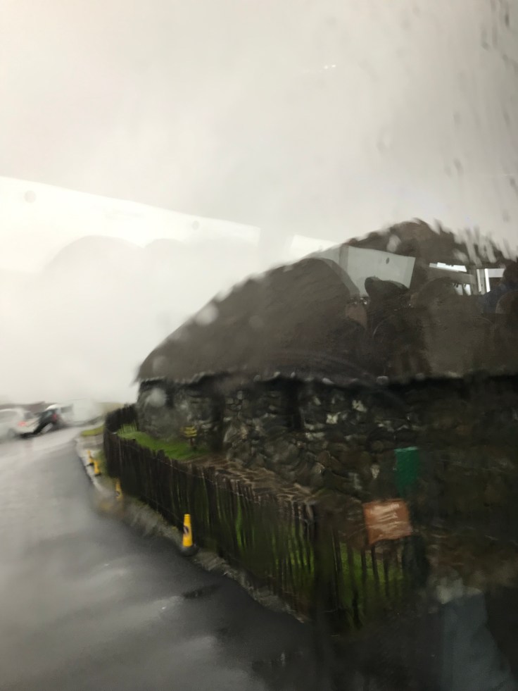 Driving around the island, I think Dan the lost Man was going around in circles wondering what the hell to do on a day of non stop rain and wind. Being a good Scottish lad, we landed at a Brewery. Well, a shop for a brewery, couldn’t see or smell any beer brewing, just bottles and bottles lined up for the buying, so this is what they do with tourists on a rainy day. A tasting and a browse of a pottery shop later and yep, BOTB. This time saturated because only one minute in the rain was like having a shower full bolt while fully clothed. Next stop were some black huts from back in the olden day. You can tell how excited I was. Given my current saturated state, I chose to stay on the bus, along with nearly everyone else! Robert bless him battled the rain and toured the huts. The first pic is mine (looks welcoming huh?) and the rest I stole from Robert…