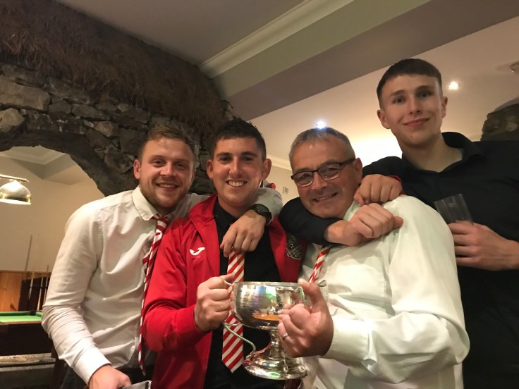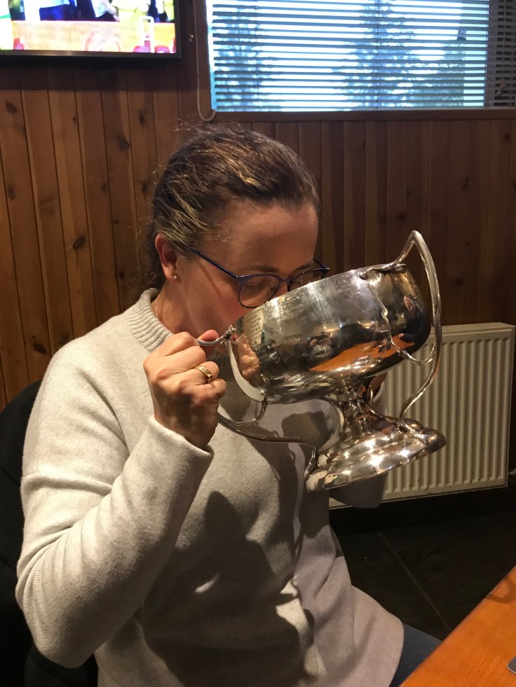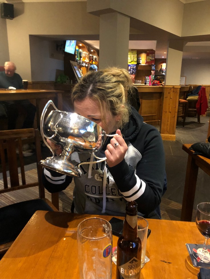 Given we couldn’t see out the windows and apparently there were no more tales to tell, I had a wee kip. It wasn’t til we were nearly back at the BNB that I woke disappointed I missed talking to the fairies, but apparently the wee stream Dan the fairy talking Man dipped his head in earlier was now a raging torrent that not even the fairies dare enter. Fair call. In what was already an wreck of a day, the windscreen wipers decided to give up battling the rain. Feck. Dan the bus driver Man managed to get us back to the hotel near our BNBs but had to call the boss and find out what the feck to do. A bus load of people to drop off and can’t see out the windscreen. So what do you do when you’re stuck on a bus outside a hotel – with a pub??? Robert the ringleader suggested there wouldn’t be many around so we could have a few quiet drinks, maybe dinner and his gracious BNB host would take us back later. Well, as soon as we opened the door to the “quiet” pub it was apparent it’d be anything but. The local football team (you know I mean soccer!) had won the premiership and were celebrating… loudly. We managed to avoid being noticed and play with a gorgeous dog but it didn’t take long for the attention to turn to the only two females in the whole damn pub!! Over came a few players, the manager and the cup of death… As Robert informed us with a scared look on his face, it’s tradition, you HAVE to drink out of the premiership cup otherwise it’s bad luck. I call bull… should have called bull louder when I saw the contents of the cup looked like this…