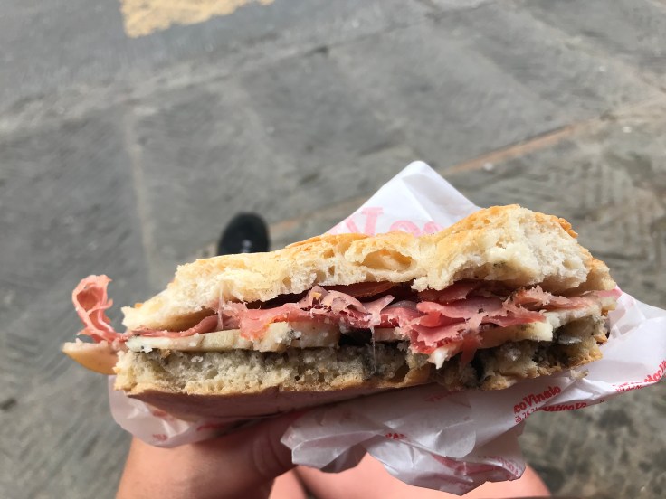 One of the millions of zillions of things I love about Florence is that while it’s a fairly big city, it is still best seen on foot. It’s one tourist attraction after another while wondering around, and to someone like me who loves beautiful old buildings, every street and back alley is a tourist attraction. The streets of Florence are like Edinburgh, every where you look there’s beauty and character, so much history in every stone cobbled street. Wandering from my Air BNB it was a short stroll across the Ponte Vecchio bridge, the most famous bridge in Florence, through the Uffizi Gallery and to the most beautiful, famous and brilliantly Italian… panini!!