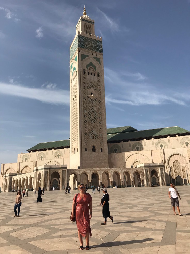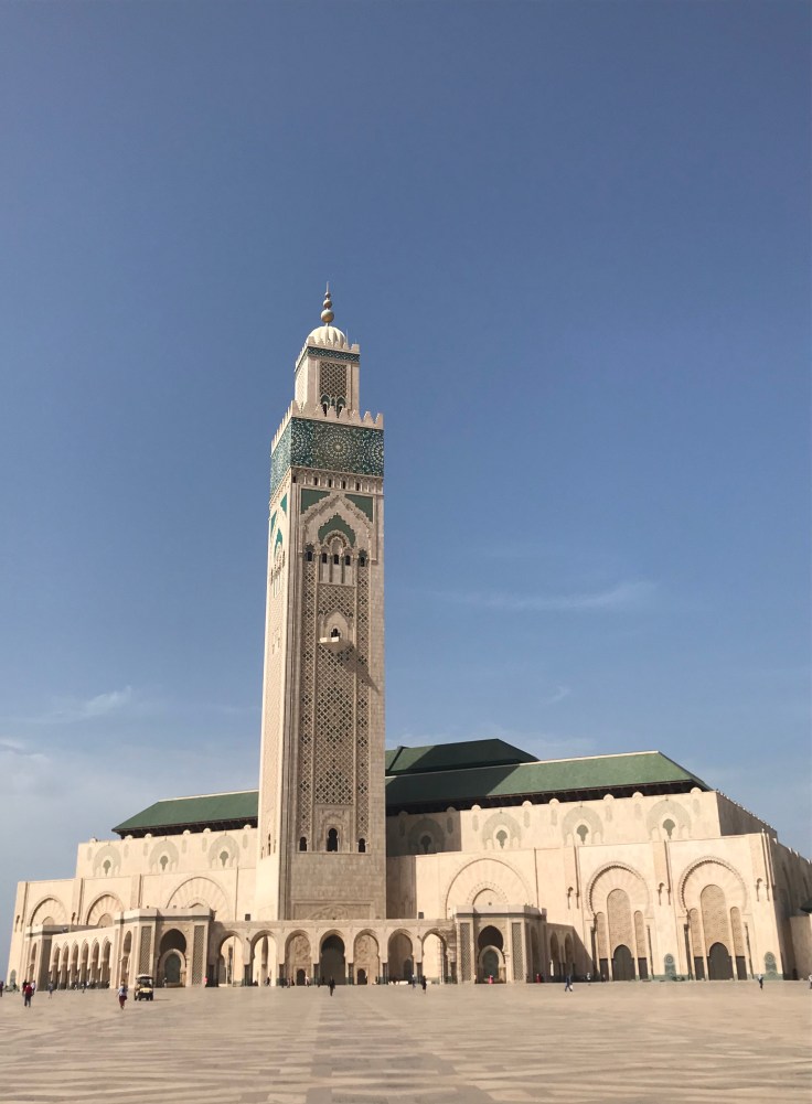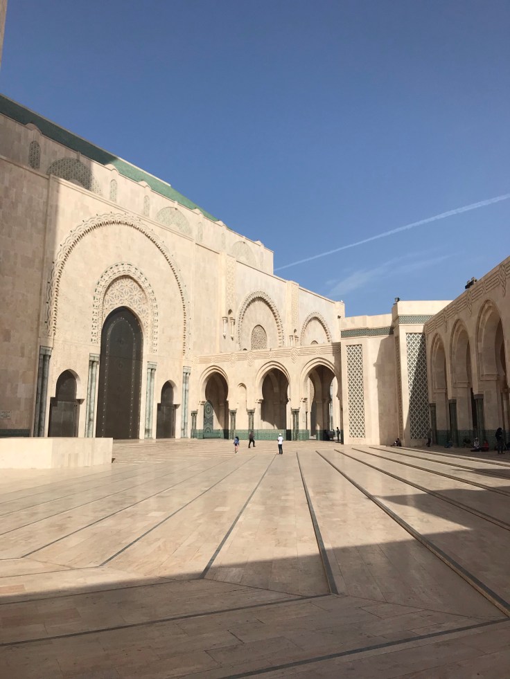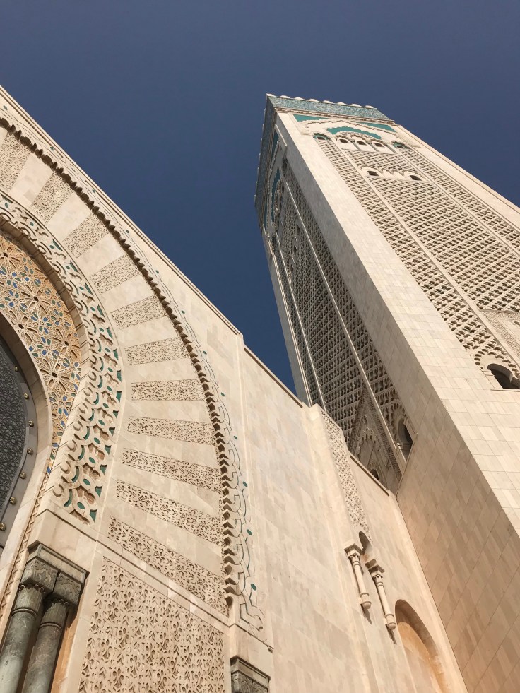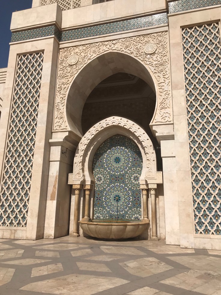 After stuffing our faces with salad, cos the salads in Morocco are ginormous and yes you do stuff your face, we went for a quick wander up the foreshore with the 10 spare minutes we had then legged in back to the bus to head for the mosque which we’d heard was kinda big. Big is an understatement of the century. And to say it’s beautiful is another understatement. Don’t know how to describe it but to say it’s one of the most beautiful buildings I’ve seen in my life. Completely different to the cathedrals of the European countries, elegant design on the outside than absolute opulence on the inside. There’s something about the shape of the arches and doorways that I love, and the contrasting colours of the blues and greens set against the sandstone, just stunning and not the Morocco I expected!