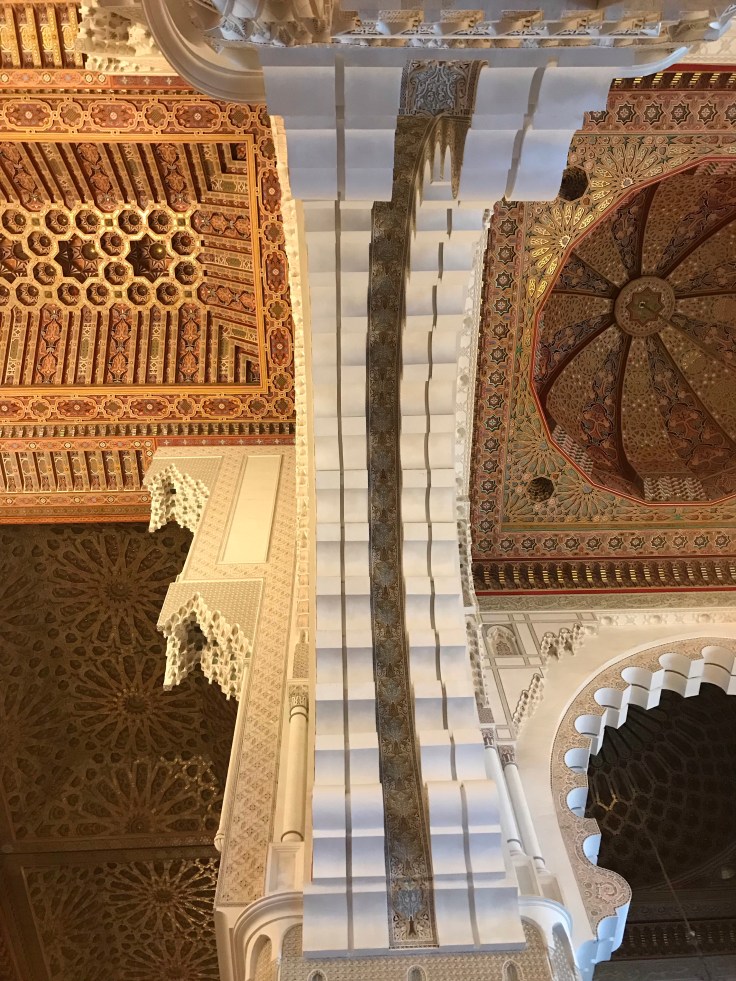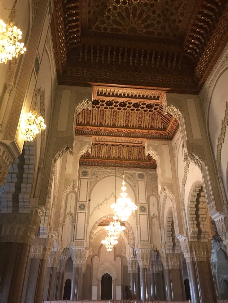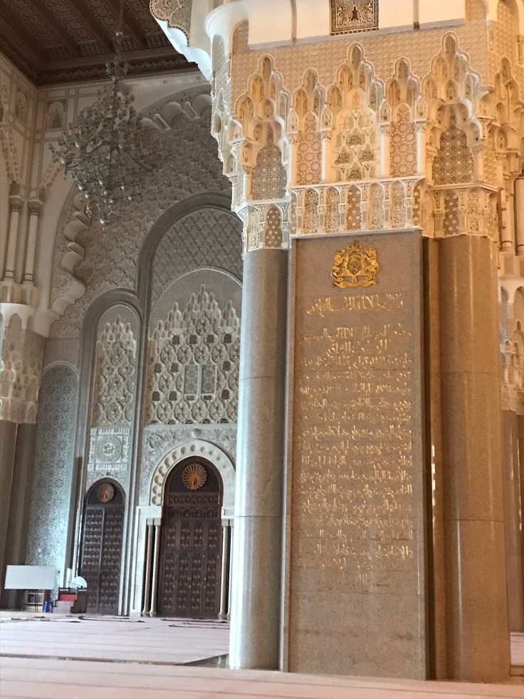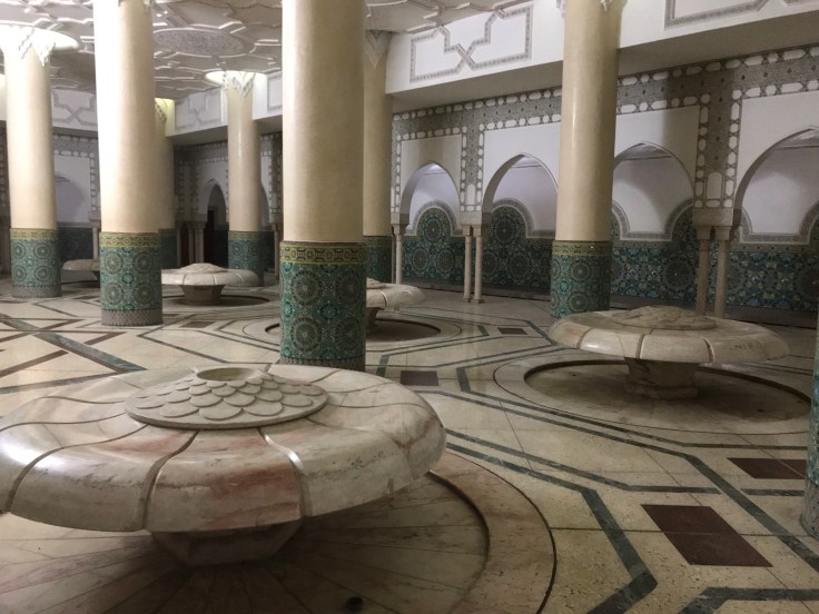 Having found the previous day a dress that covers all the things while not sweating me to death, the only requirement to enter the mosque was shoes off. After sweltering outside, the cool marble floor on our feet was more than welcome. As were the bags provided to carry our stinkin shoes, someone had their thinking caps on for that one. The Mosque is actually called the Hassan II Mosque, the King who commissioned it to be the biggest and most grand building in Morocco. Cos that’s what makes a good King, have a massive building named after you, not like, taking care of your people and creating prosperity and equality for all. Anyhoo, Mr Hassan got his wish and it ended up being the largest Mosque in Africa and the third largest in the world. When it cost a whopping $600 – $800 million USD to build, you’d certainly hope so. The King didn’t have all that cashola himself so Saudi Arabia, Kuwait and Dubai spotted him, he obvs didn’t listen to his mother, if you can’t afford it, you don’t need it. Besides the money thing and do you really “need” a big arse Mosque, the fact that all the building materials were sourced in Morocco is pretty impressive. Well, except the Venetian glass and white marble which came from Italy but guess they don’t have those things in Morocco. And second most impressively (that’s a word right?) is that the white marble columns are natural humidifiers, somehow the marble absorbs the humidity in the air. For reals. And third most impressively, this place fits 25,000 people inside and 85,000 outside in the square. Sure women have to use the upstairs platforms to worship but it’s a matter of custom, at lest they are allowed in. Ok, so now for the most impressive of the impressively’s (defs not a word), the roof opens!!!! I kid you not, the place has a retractable roof, just like a football or tennis stadium. So worshippers can be closer to god, no wait, so they can have all the elements present when worshipping I think? There were these water well things in there too so I think it has something to do with that. So apparently with all these impressively’s it took 6 years to build, with people work ing 24/7 in 3 shifts. That’s some epic project management! The inside though, just wow upon wow and all the impressively’s in the world!! Unfortunately in discussing the impressively’s I think I swore, probs going to hell..