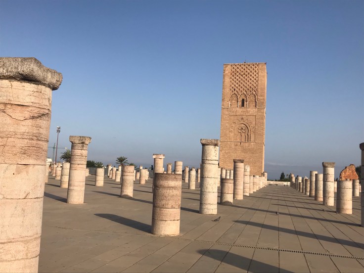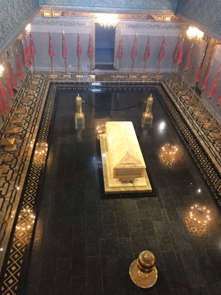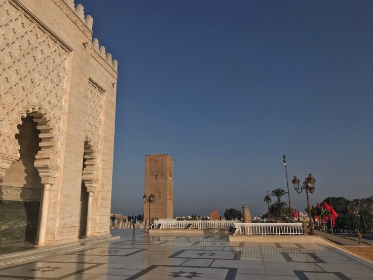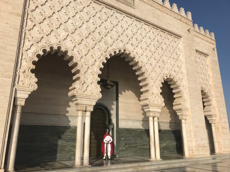 The plan was for the mosque to have 253 columns to represent the days of the Muslim lunar calendar, but they only made it to 80 something I think. Didn’t quite listen to everything Abdul said, too busy looking and I can’t do both so had to ask Wikipedia for some help… apparently some dude called Yusuf Yaqub al-Mansur, member of the Almohad Caliphate, a Berber Muslim empire commissioned a tower that was intended to be the largest minaret in the world along with the mosque, also intended to be the world’s largest. Again, why do men measure their worth by building the biggest something?? Anyhoo, when the dude died in 1199, construction stopped. But now I get why the guards are here, I tuned into Abdul again once he started talking about the Mausoleum of King Mohammed V, a King is buried here, makes sense. Never been so close to a King before, dead or alive. This King was so important because he kicked arse and worked hard for the independence of Morocco, he was their Nelson Mandela. This dude I would have liked. Heading to the Mausoleum, the site is stunning, even unfinished. Can hardly imagine how magnificent it would have been. The Mausoleum once again had the stern looking guards, and inside a man chanting the Quran so no talking, pictures ok but no flash. Have to say, there is something about the Arabic/Berber language I think sounds so beautiful. Especially when sung. Might have to get some Arabic music on my playlist. The Mausoleum was beautiful inside, as expected, and strangely, had a feeling of power and grace. Probs makes no sense to others but you certainly felt moved and privileged to be there.