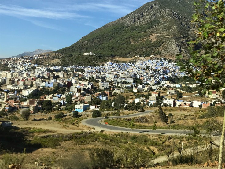 Nearing the blue city, Abdul gets his google on again for our intro to Chefchauoen. Just gonna spell it wrong! So the place is known for being blue, got that, but also well known for its goats cheese, olive oil and hash. Hash as in pot, but stronger and kinda illegal but ok to buy if you wanna smoke it. Not sure how that works but ok. Apparently as a dude, you’ll get offered it by every second person but the chicks not so much, it’s a respect thing. Nice to know. To say the blue city sticks out like a sore thumb is an understatement. The countryside is all red soil with green, green, green then there’s the big spot of blue on the hillside, looks a little something like this: