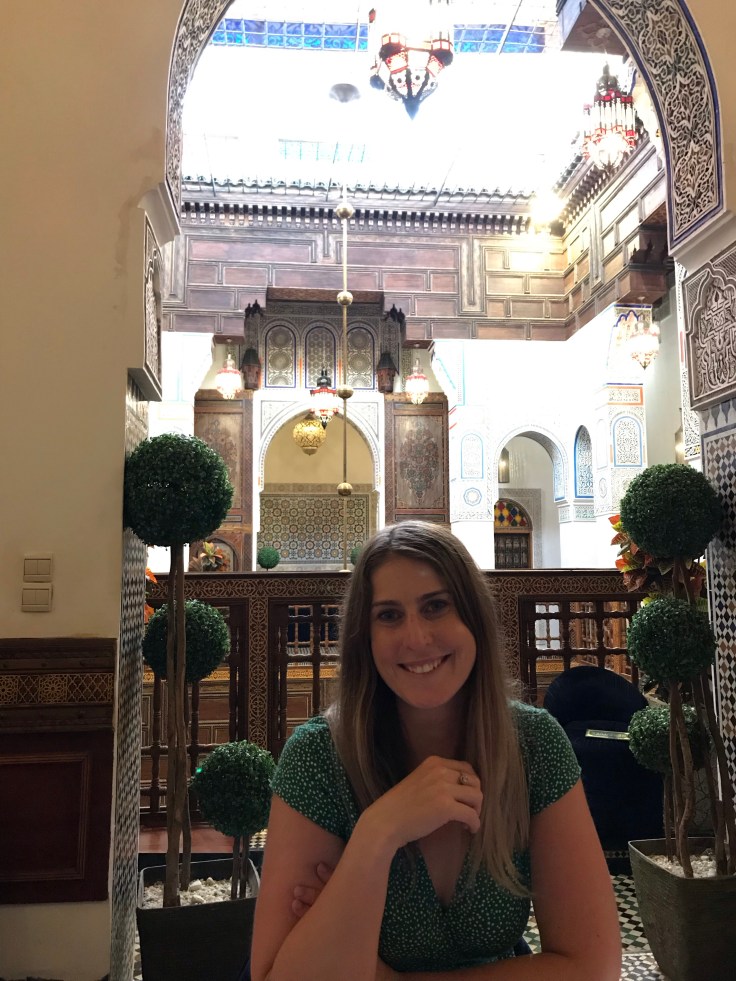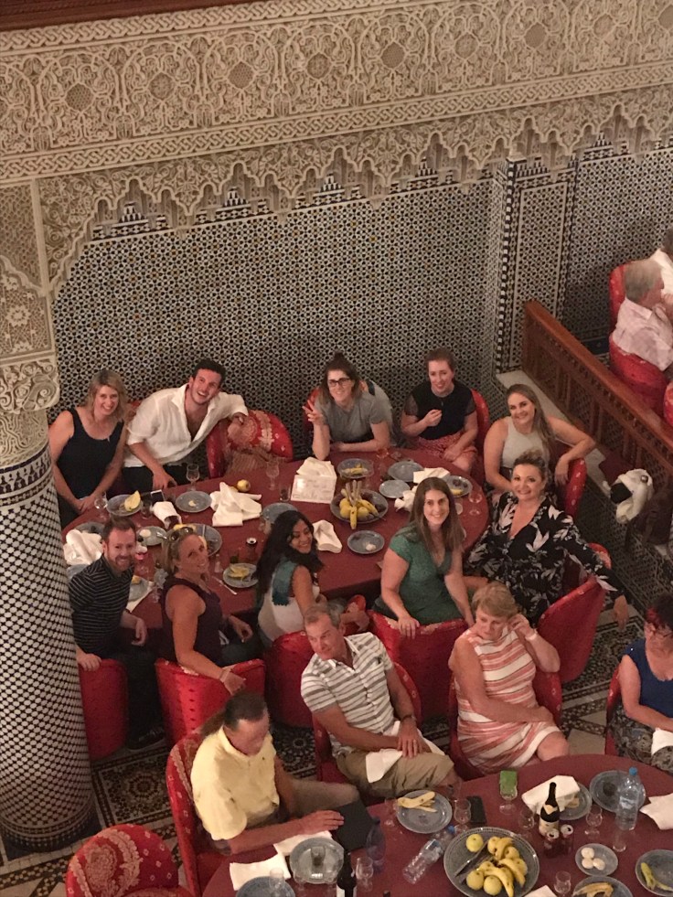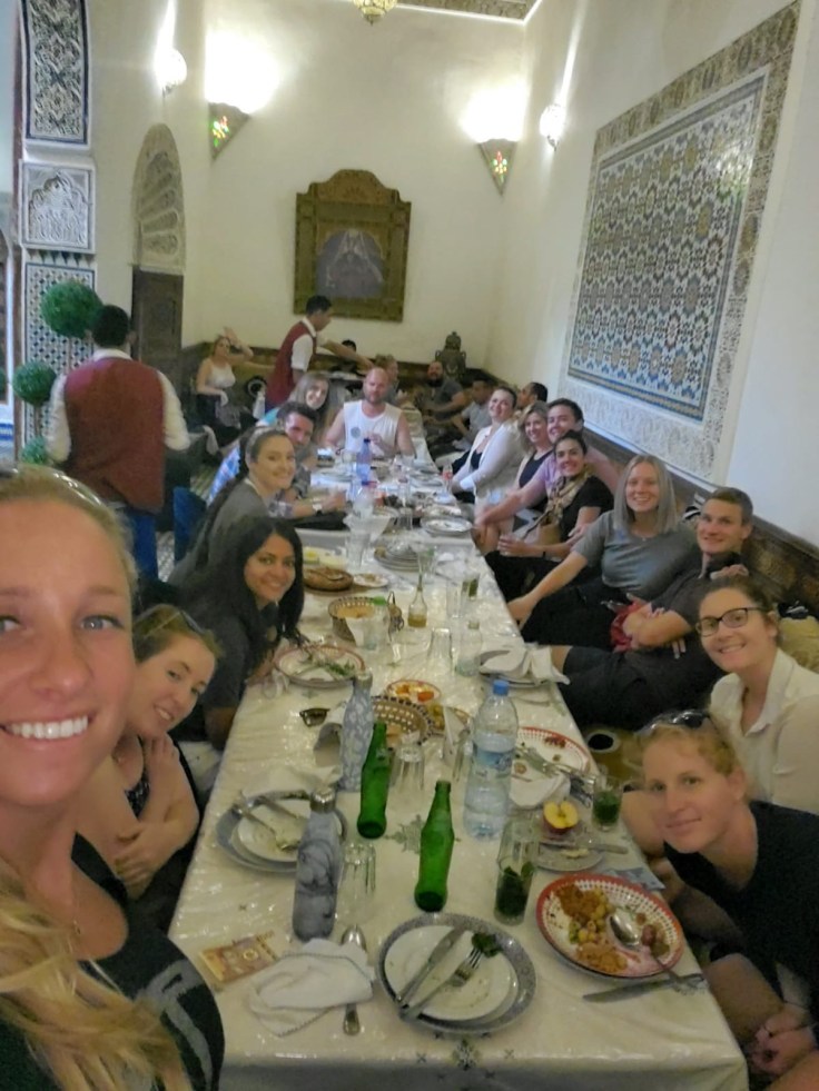 Pulling into Fes, Abdul was just as tired as us so the brief on Fes was short, or I was being a bad student and not listening. So Fes has a population of 1.6 million people and the name means axe in Arabic. Also has the oldest Médina in Morocco and is home to the very first university opened in the world, opening in 859 by a lady called Fatima. Finally at the hotel in Fes and geez bananas, it’s like a resort, probs only a 3 star one but has a massive pool, deck chairs and looks like it would have been fancy, in the 70s. After a short chill by the pool because I still didn’t have bathes, it was then a quick outfit change before running out the door to a traditional Berber dinner of dancing, food, performers, all the bells and whistles. I had my favourite dress saved for the night, too bad as I was running out the door I couldn’t find my sandals so had to wear my tiger sneakers, pretty dress and sneakers, classy. At the dinner we were ushered to a table at the front, I should have known better than to sit so close to the stage… not only did I get pulled up the first time when they wanted drummers, but also the second time when just one person from the crowd had to belly dance… lucky for me there was plenty of wine so some how had the balls to dance on stage… sober Holly is embarrassed….