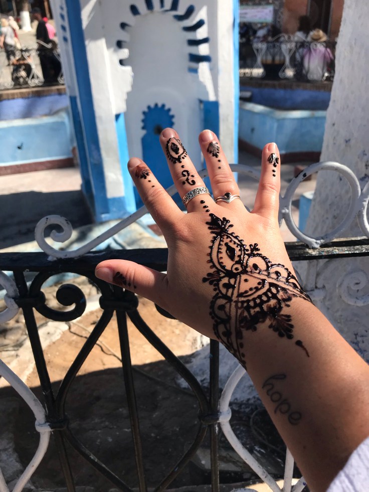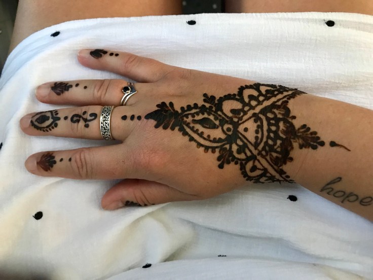Having agreed to meet Kylie and her pack in the square at midday to get lunch, I was kinda stood up. Well not kinda, really was. During my wait, I got offered henna (henna not hash mum!) so thought why not?? Abdul had warned us to only to get the green one as the black can get itchy. I thought I’d asked for the green one, but obvs didn’t…