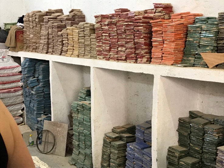 From the fort it was onto the Poterie de Fes, a massive mosaic place/shop/factory. Nothing like a distraction to get my mind off Maccas and the fort. And it was one hell of a good distraction, beautiful tiles hand cut into shapes and stuck onto absolutely everything, tables, mirrors, fountains, you name it. And all done by hand, dudes with tiny little chisels cutting the tiles, other dudes creating the patterns, others making pottery, others hand painting things. All hand made, if only I had the cashola to ship a tonne to AUS!!