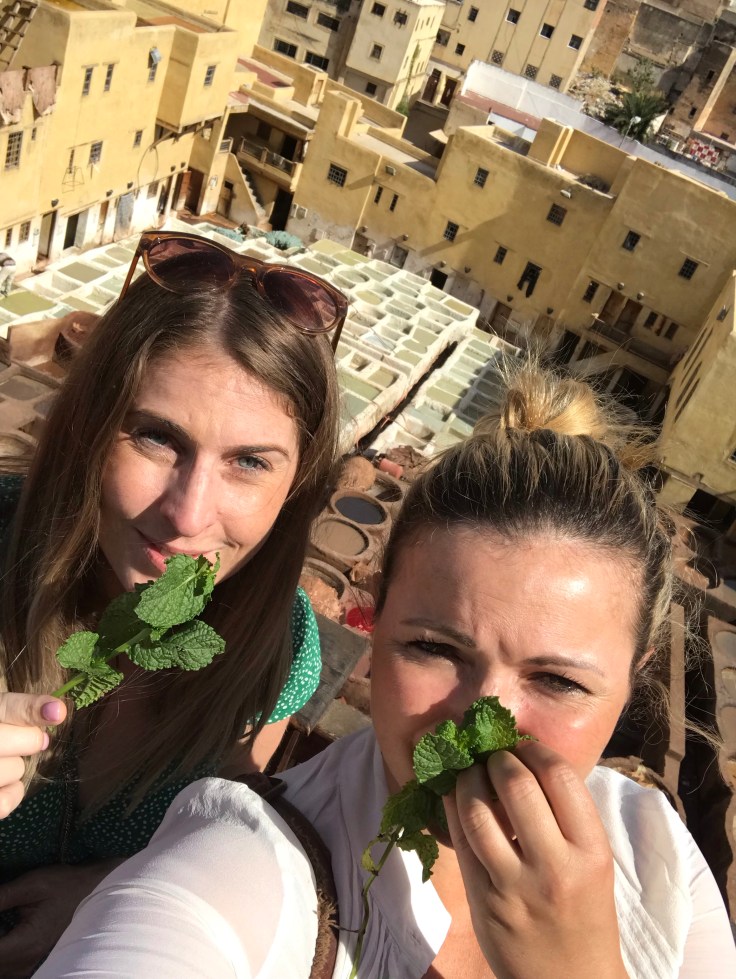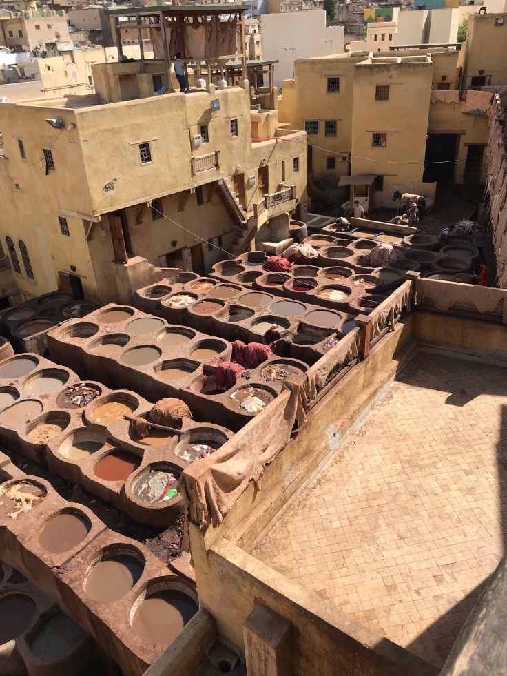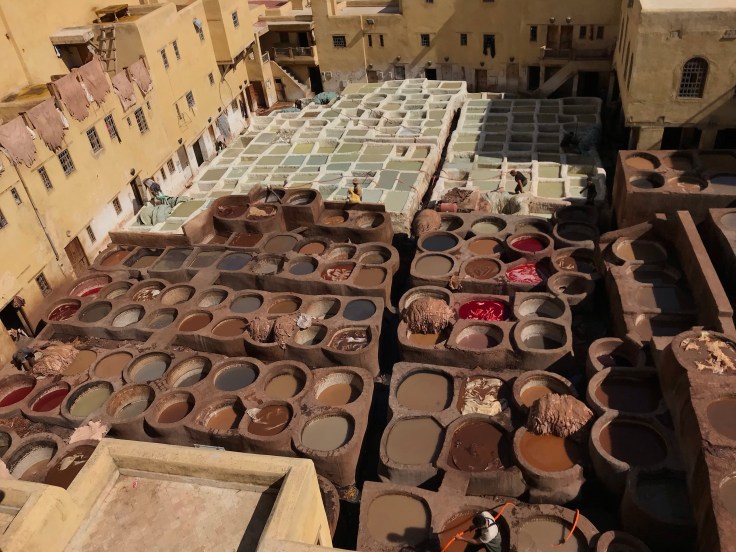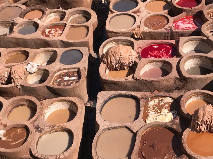 Not only did we have lunch in one of the most gorgeous spots, but the pastilla was top notch, if only it came with a side of fries! Fed and feeling nearly human again, we were off to the tannery. It was as we approached and there was a whiff of something dead in the air, I remembered the warning, the place is supposed to absolutely reek. And yep, whoever told me that was right. The place smelt like dead meat that’s rotting… guess that’s kinda what leather is, except it’s the skin… lucky the place is pretty, and they do give you mint to shove up your nose to help with the smell…