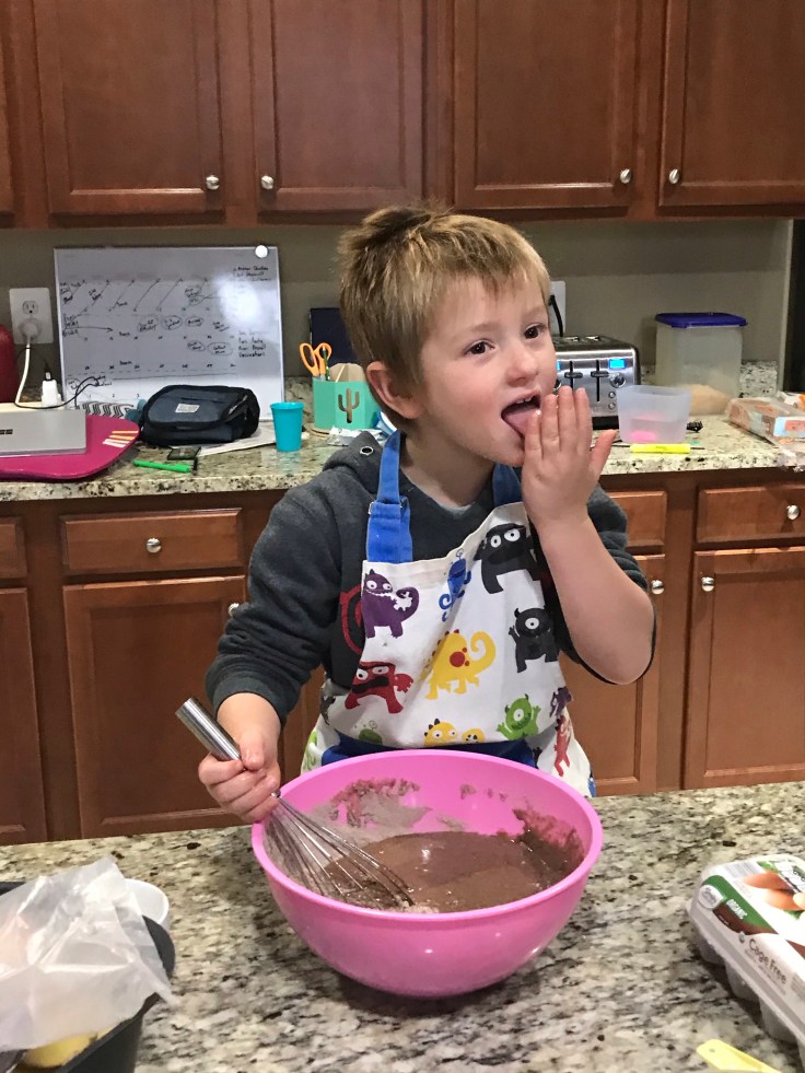 So it’s a rule in Maryland that if snow is forecast for the day, kids don’t have to go to school. Unfortunately this snow made a surprise appearance so the kids were to experience their first snow while at school. Unfortunately the snow didn’t stick and was well and truly over before the school bell. While I did more of nothing, Katie picked up Drew and to keep him entertained, it was cooking time. I’ve mentioned it before and I’ll mention it a million times more, this kid is hilarious. A funny little personality that can be oh so serious for when it’s time to cracks eggs into the bowl, little dude can cook too, definitely showed up this old lady!!