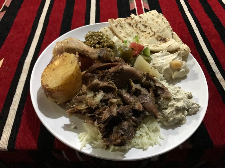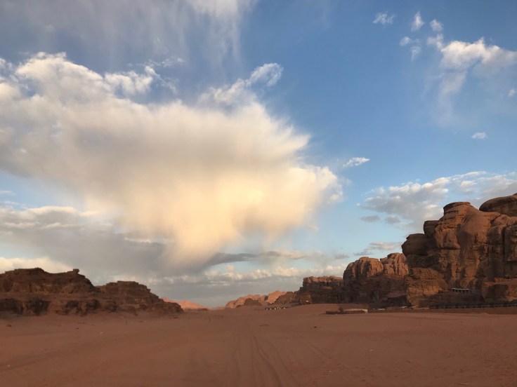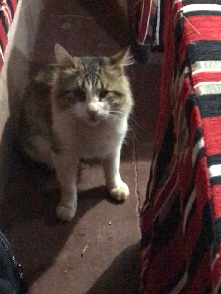 Unfortunately we then had to go back to camp, really would have loved more time to explore the desert, the Jeep tour felt like a teaser! Anyhoo, back at camp we got our alloted rooms, got to choose to bunk with Liz, these camp rooms/tents had little en-suites, nice to not have to leg it across the desert in the middle of the night for the loo! And now, time to chillax. Out came the wine, down went more cold and flu tablets and I made a real effort to talk to people. I’d been feeling so shite I hadn’t made the time to really talk to everyone and find out their stories, also because when you’re sick, people kinda avoid you which is fair, when you’re traveling you do not want to be ill, you miss out as per Budapest! Would have avoided me too!! But I tried, chatting over a wine while standing in the desert camp and waiting for our dinner to be dug up. Yeah, this finally was traditional Jordanian style, like a hangi in New Zealand, they bury a basket of meat and veg in hot coals in the sand where it cooks into awesome yumminess. And by gosh it was good!!! And like Morocco, the kitty cats joined us for dinner!
